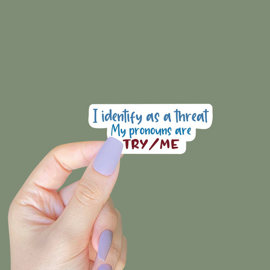 I Identify as a Threat, My Pronouns are Try/Me Sticker