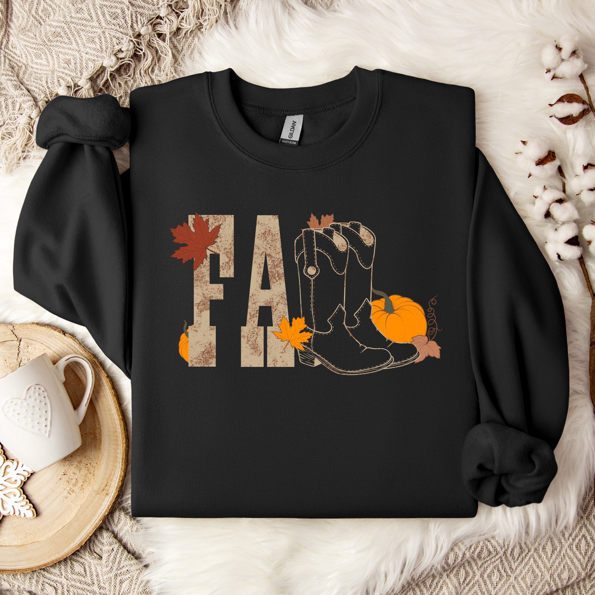 This comfy, western-inspired sweatshirt spells out FALL with a twist—the “L’s” are classic cowboy boots, surrounded by pumpkins and autumn leaves. Perfect for pumpkin patch trips, rodeos, bonfires, or just sipping cider in style.
